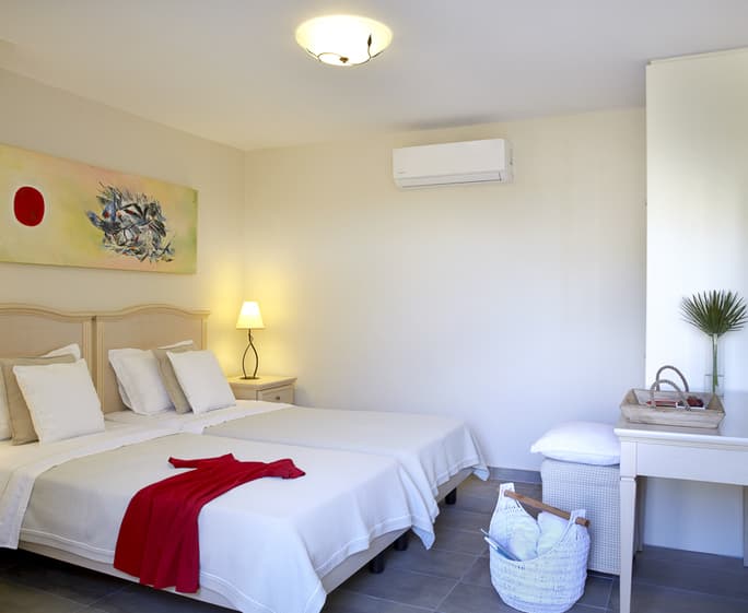 The bedrooms are all equally stylish. Choose from a large twin with balcony or the master double bedroom with a wardrobe, wing-back chair and cabinet.