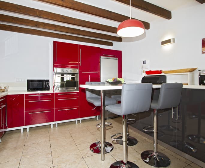Inside the villa, rustic and contemporary furnishings combine to create an inviting feel. You have three double bedrooms – the master features a four-poster bed, en suite bathroom and a balcony with wonderful views of the sea and the mountains. There is family bathroom and a shower room, as well as a games room with billiards table, dart board and the like – there’s room to put two fold-out beds in here to accommodate younger guests.