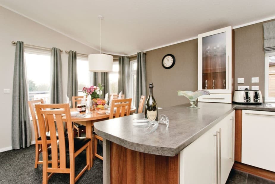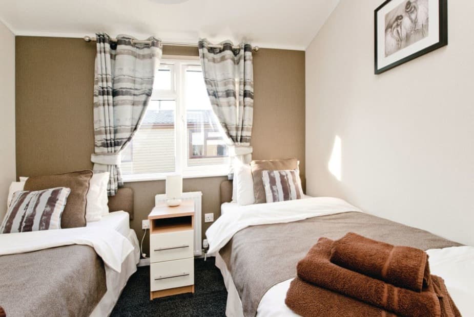 Modern and contemporary luxury lodge. Master with king size double, ensuite shower and flat screen TV and two twin (one can be linked to form double). Bath with overhead shower. Spacious open plan living area with in-lodge sound system. Open plan kitchen/dining area. Double doors to decking with outdoor hot tub.