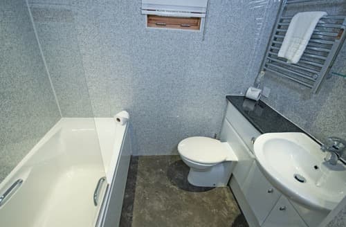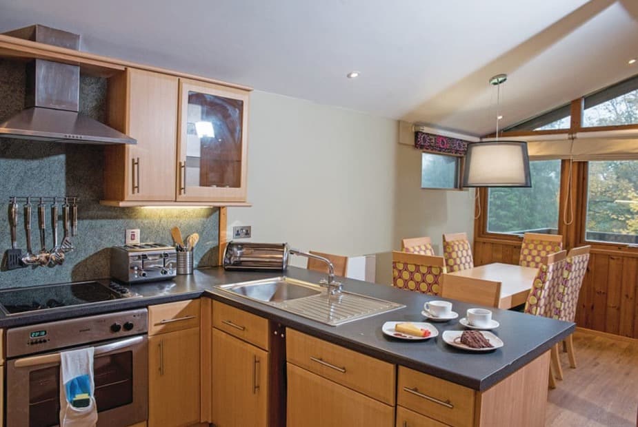 Spacious lodge with one king size double with ensuite shower, one twin and one twin. Bath with overhead shower. Open plan lounge/kitchen/dining area leading onto balcony. Dishwasher. Outdoor hot tub. Pets in specific lodges only.