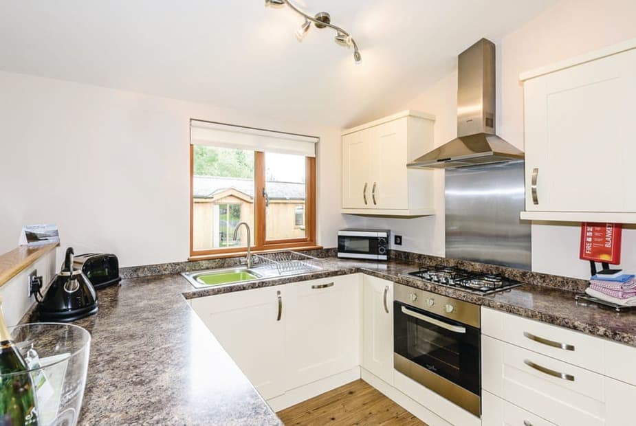 Deluxe lodge designed with luxury in mind. One master double with ensuite shower and one twin. Bath with overhead shower. Open plan living space with full length windows and woodburning stove. Door from kitchen leading to the rear of the lodge with outdoor hot tub.