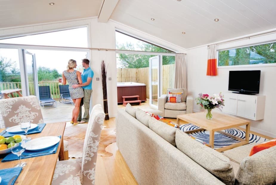 Contemporary and spacious retreat. King size four poster with flat screen TV with Freeview/DVD, open plan ensuite with luxurious spa bath, double shower and underfloor heating. Open plan kitchen/living area. Decking and outdoor hot tub. Perfect for spoiling someone special.