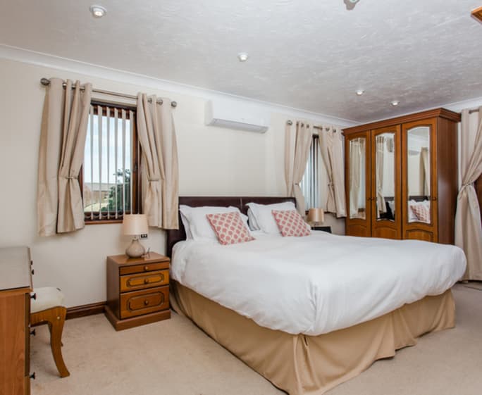 Master BedroomKing size bed, wardrobe, chest of drawers, dressing table and a mini fridge