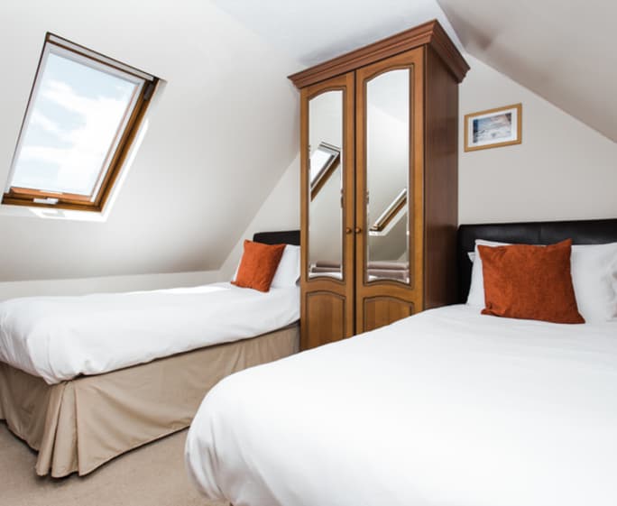 Twin beds, seating area with sofa bed, wardrobe, chest of drawers and mirror