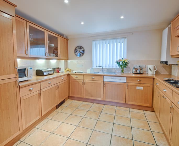 Equipped with a full range of utensils and accessories including kettle, toaster, coffee machine, bread bin, iron and ironing board